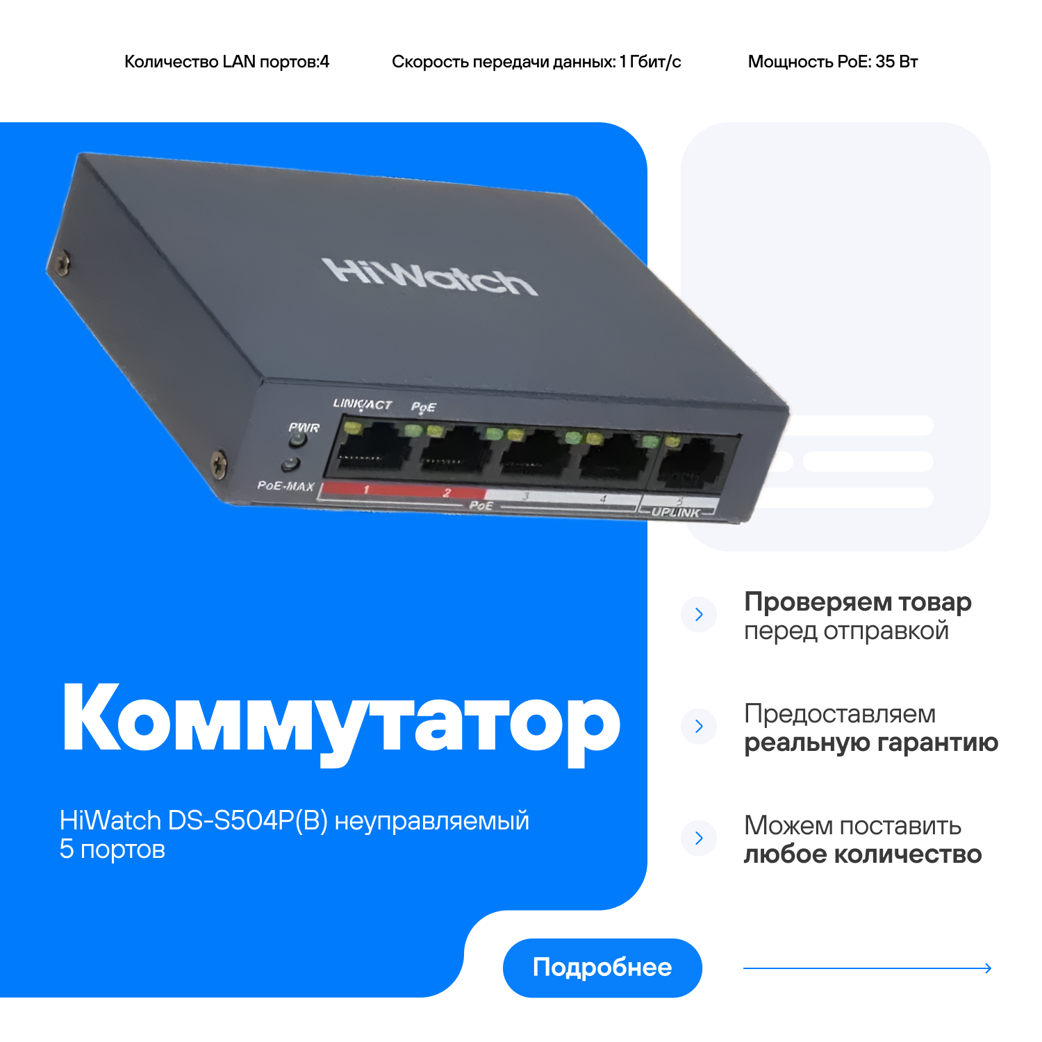 Ниже Вы можете прочитать отзывы на Коммутатор PoE HiWatch DS-S504P(B) (5 портов 10/100Mb/s; 4xPoE 10/100Mb/s) 35W, ознакомится с подробными характеристиками, посмотреть интересные обзоры и фотографии на Коммутатор PoE HiWatch DS-S504P(B) (5 портов 10/100Mb/s; 4xPoE 10/100Mb/s) 35W.