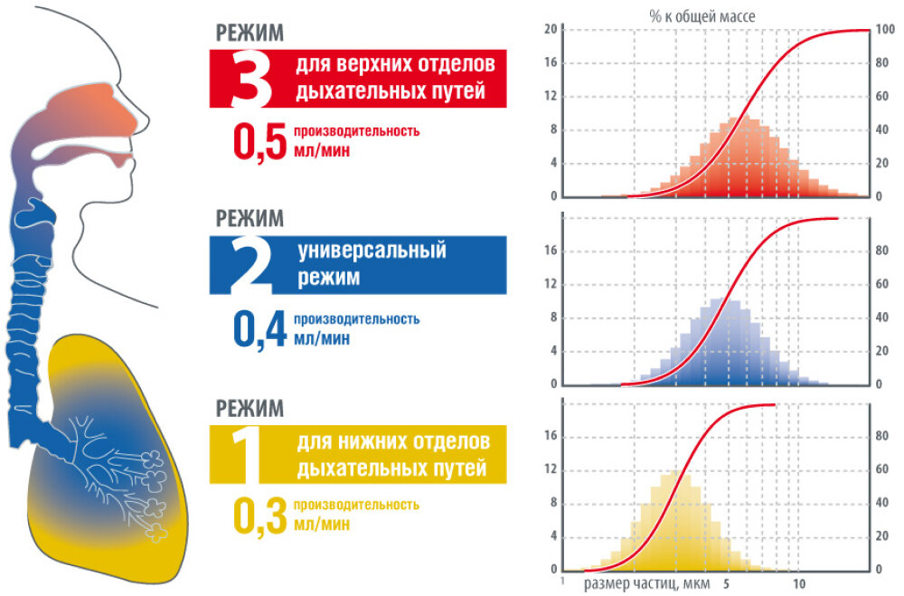 | Дополнительная информация | три режима работы небулайзера: – режим 1 – преимущественно для нижних отделов (например: бронхит и бронхиальная астма); – режим 2 – универсальный; – режим 3 – преимущественно для верхних отделов (например: синусит, ларингит, трахеит, ОРВИ); потребляемая мощность: 60 Вт |
