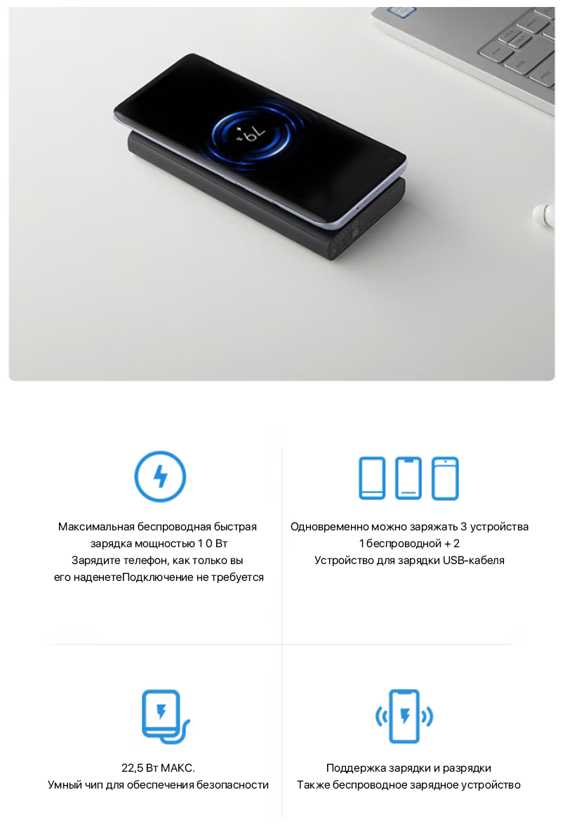 | Плюсы: | Качество сборки, беспроводная зарядка, быстрая зарядка самого блока. |