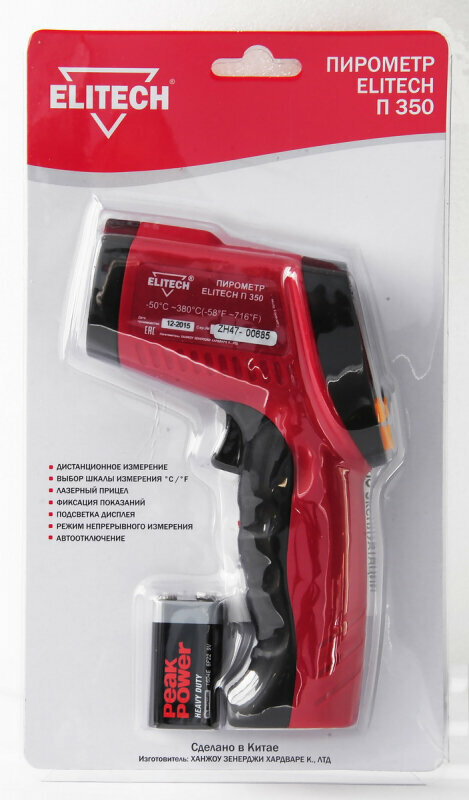 Пирометр ELITECH П 350 Пирометр,от-50 до+380град,9В батарея,лазер,ЖК дисплей,0.15кг,блистер