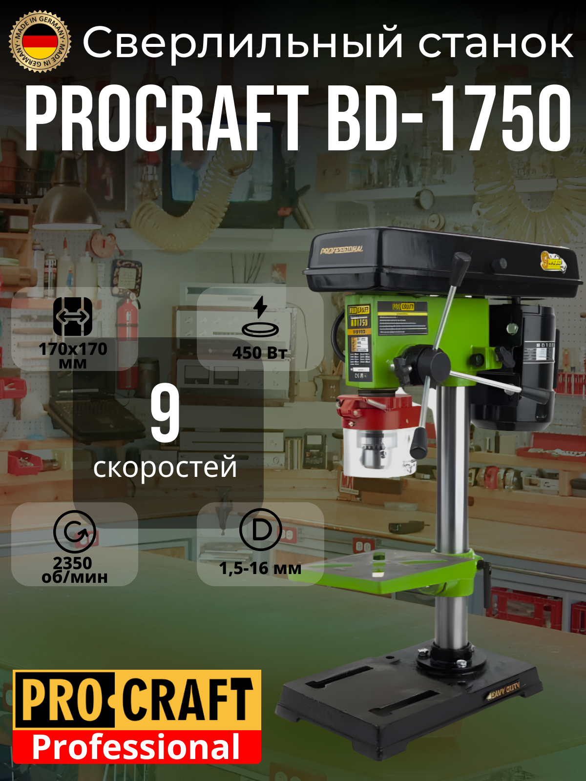 Сверлильный станок Procraft BD1750, 9 скоростей, патрон 16мм, 2350об/мин, 450Вт