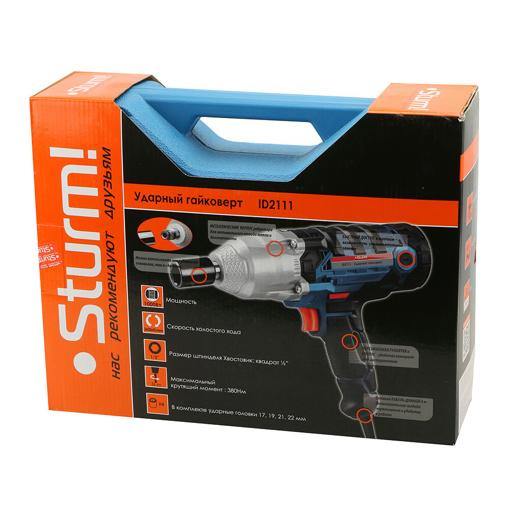 ID2111 Гайковерт сетевой Sturm! Мощность 1000Вт, крут. момент 380 Нм, 4 ударн. головки, кейс Sturm!