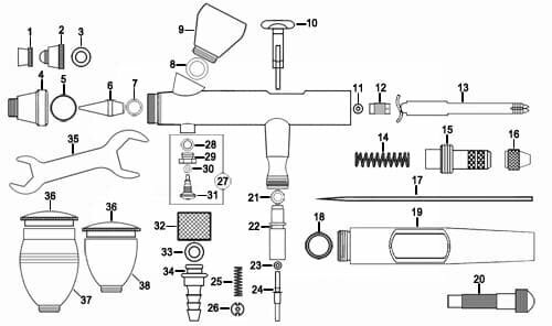 | Комплектация | аэрограф, емкости под краску (1 шт. х 2 мл, 1 шт. х 5 мл, 1 шт. х 13 мл), пипетка, ключ, инструкция, коробка, бланк гарантийного талона |