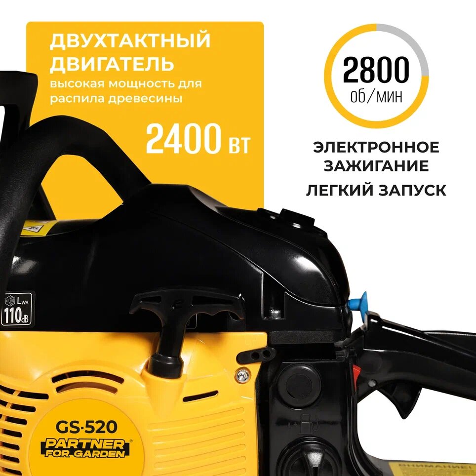 Бензопила цепная / бензиновая цепная пила Partner for Garden GS 520P ( 3,5 л.с, мощность 2,4 кВт, объем двигателя 49,3 см3 , длина шины 20" - 50 см )