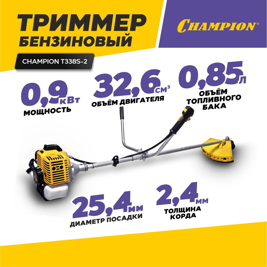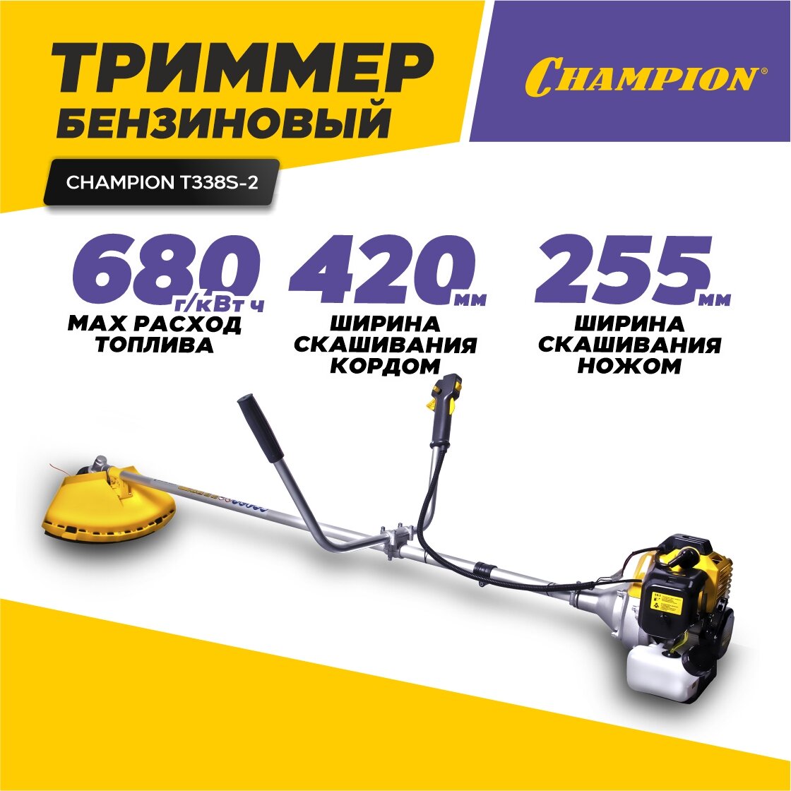 Триммер бензиновый для травы садовый CHAMPION Т338S-2 (мощность 0,9 кВт / 1,22 л.с, ширина скашивания 255 мм / 420 мм)