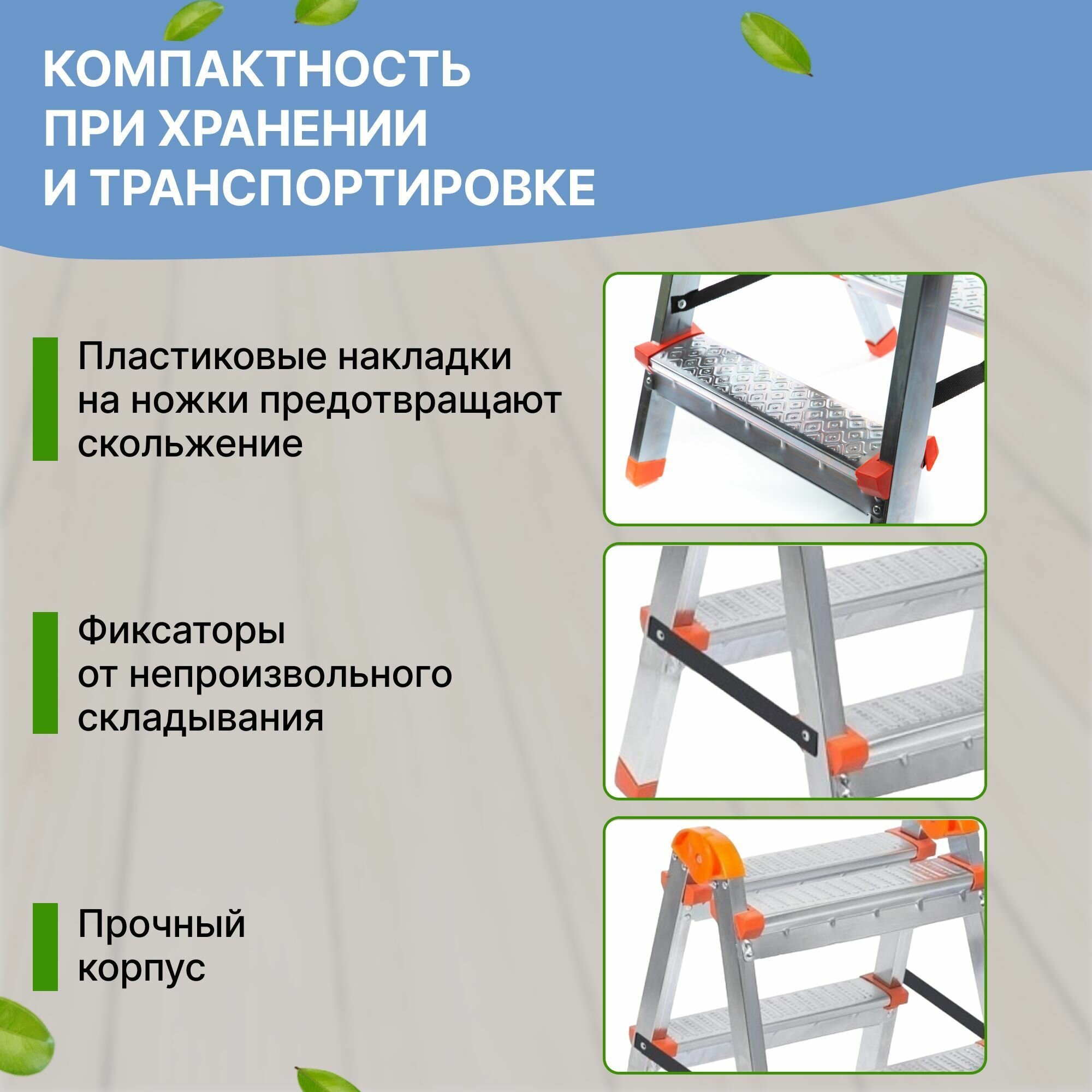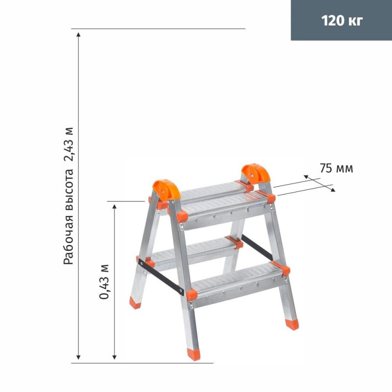 На самой стремянке указано: Материал сталь. Нагрузка до 120кг. Вид у стремянки совершенно другой, хотя артикул тот же. |
