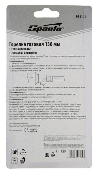 SPARTA 914125 Горелка газовая, тип "Карандаш", 2 насадки для пайки, 130 мм Sparta 914125 SPARTA 914125