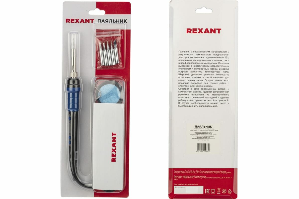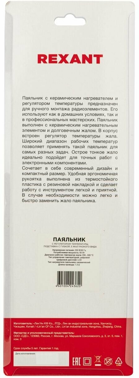 Паяльник REXANT подставка, набор из 5 жал, цифровой, керамический нагреватель, 200-500 °C, 220 В/65 Вт