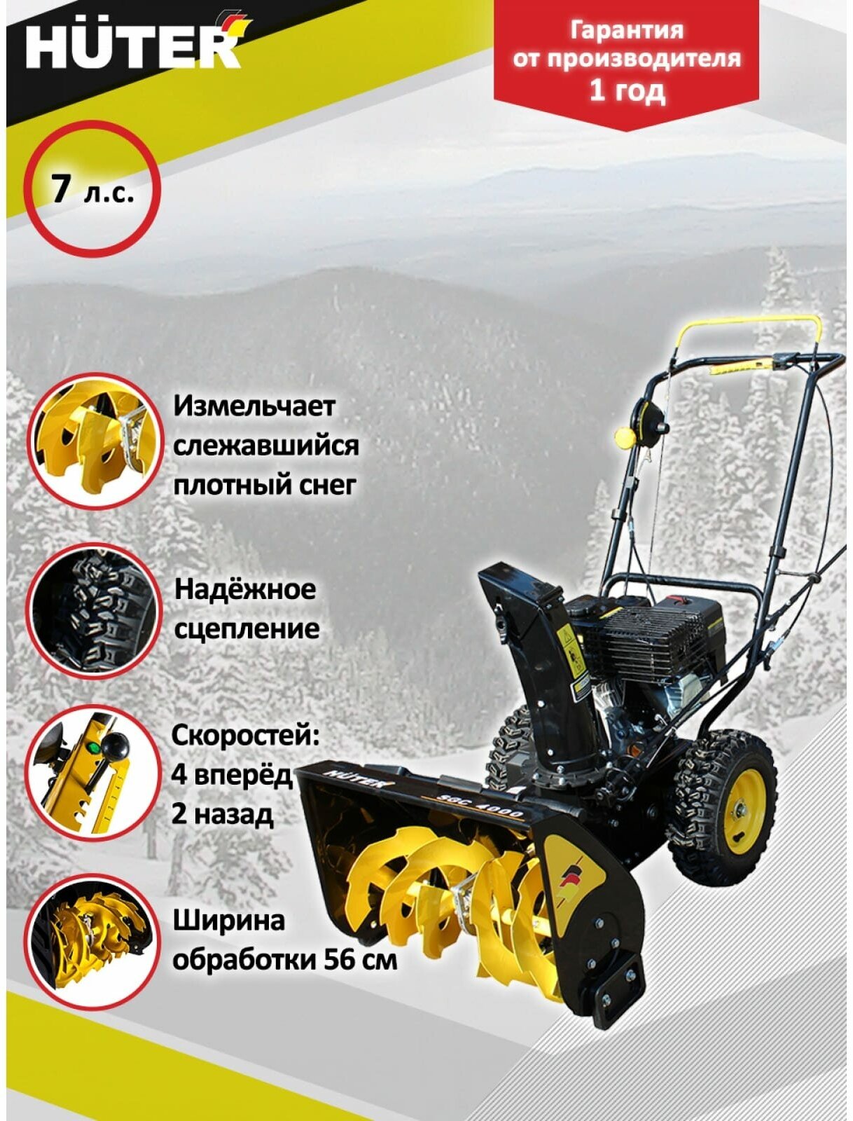 4-тактный двигатель, металлический шнек, направление выброса меняется, вперед 4 скорости и 2 назад.