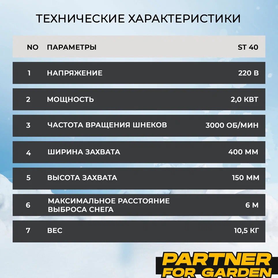 Снегоуборщик электрический / Снегоуборочная машина / Снегоочистители Partner for Garden ST 40 ( 2000 Вт, ширина захвата 400 мм, выброс снега до 6 м ) снегоуборочная машина электрическая