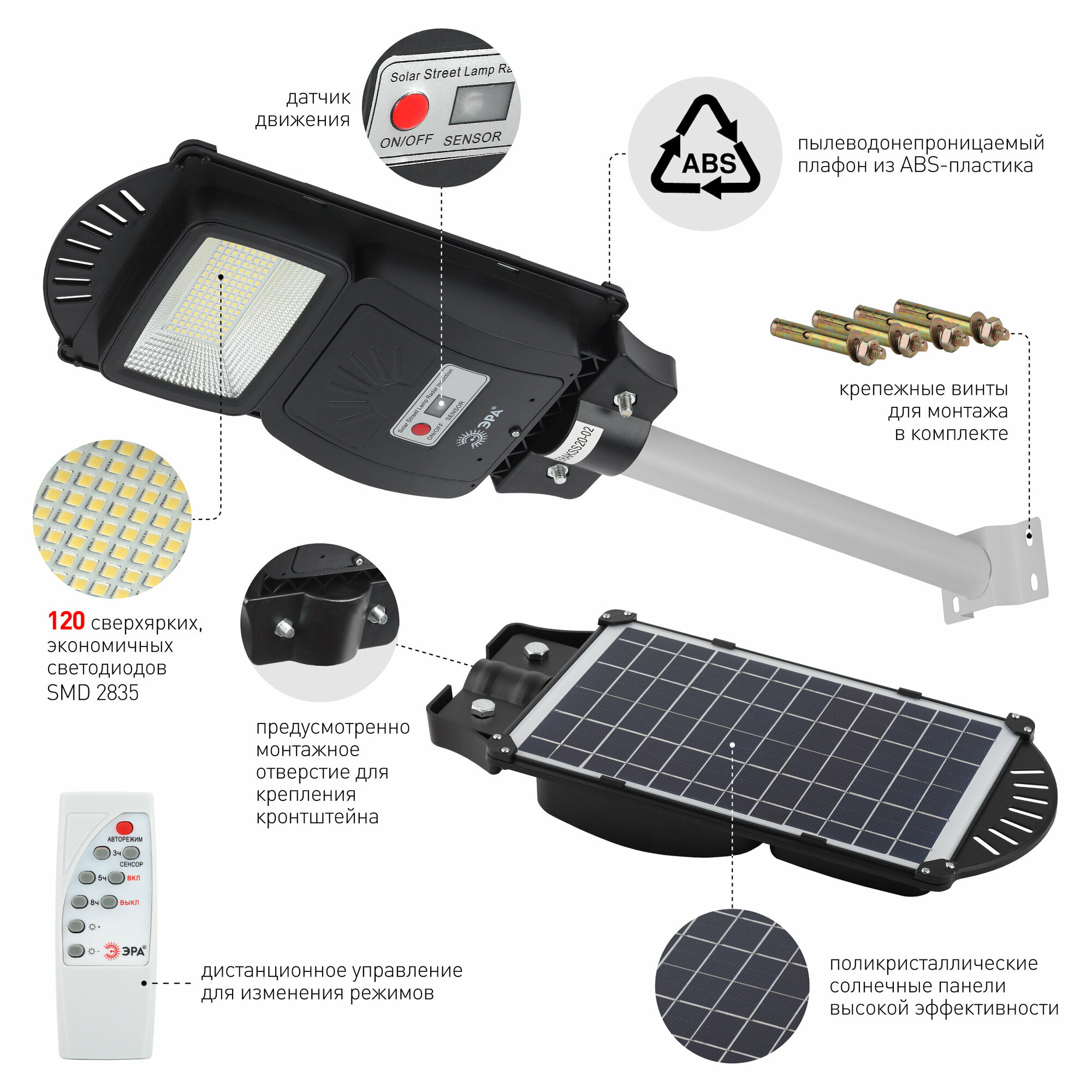 Купить Светильник светодиод консольный на солнечной батарее ДКУ/СКУ 20Вт 5000К 400Лм черный с датчиком движения ПДУ IP65 ERAKSS20-01 ЭРА
