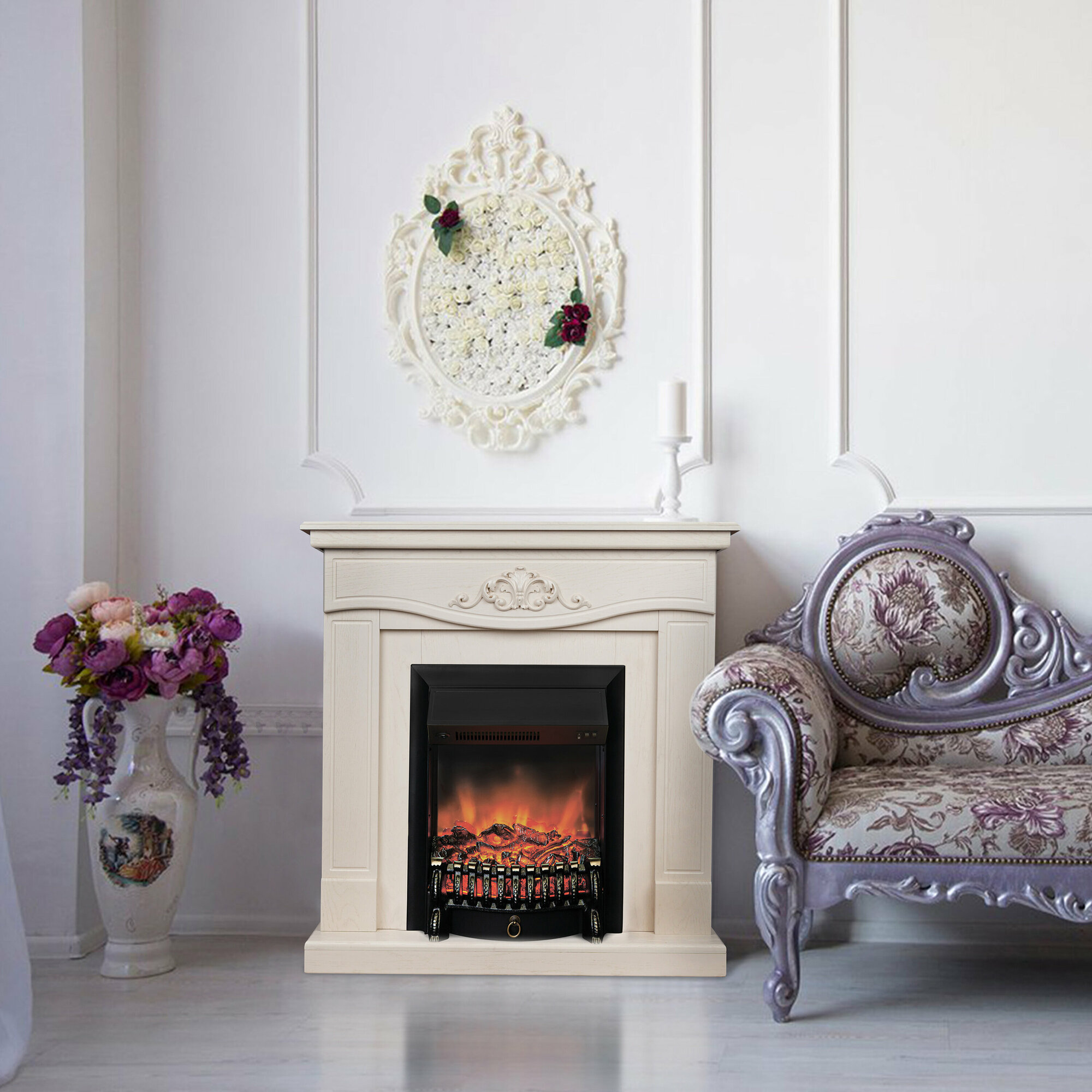 Электрокамин RealFlame Junona WT МДФ с очагом Fobos, звук потрескивания дров, обогрев, имитация пламени