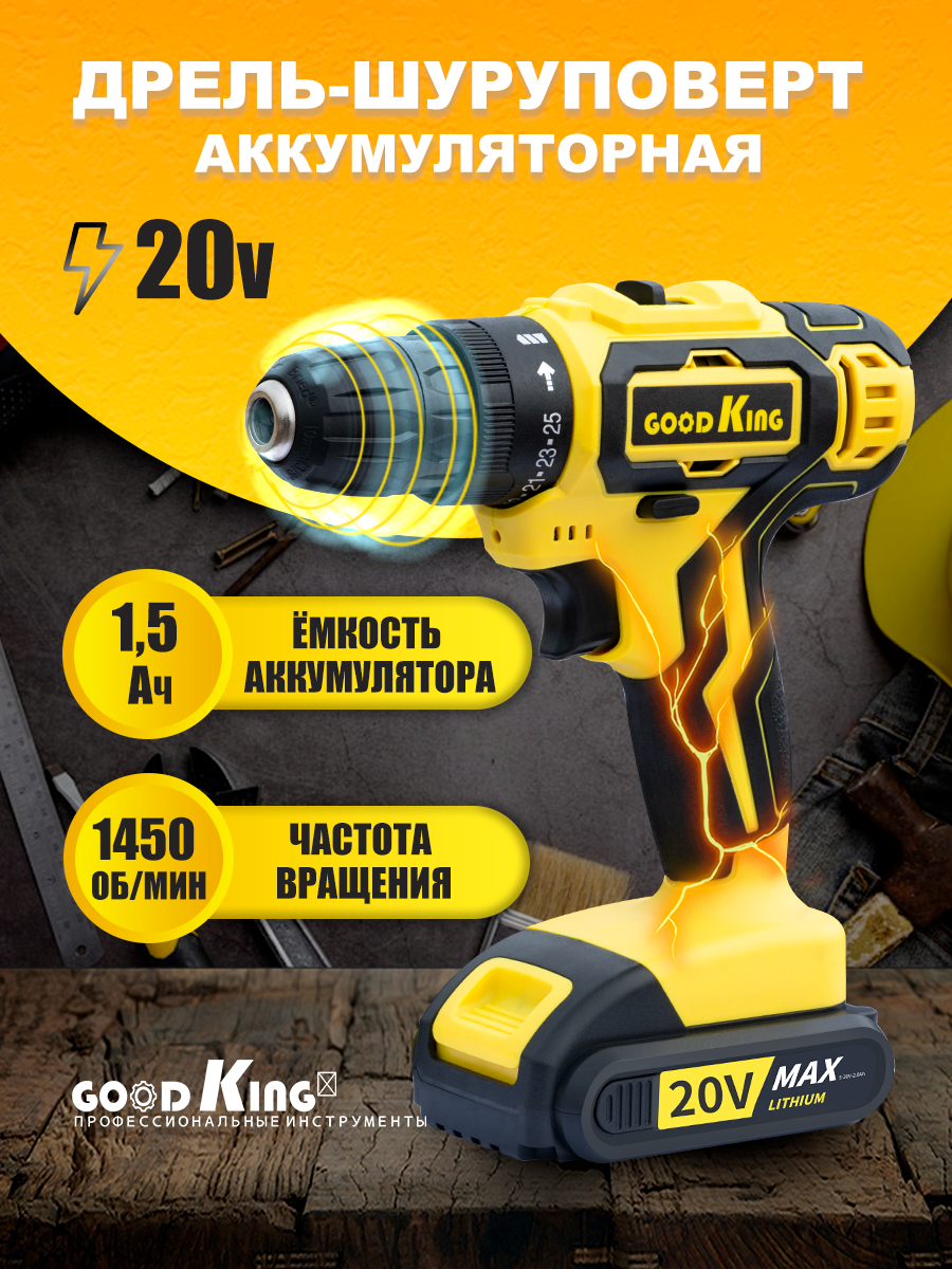 Дрель-шуруповерт, Сменный аккумулятор, 20 В, 30Нм, 1 АКБ, 1500 mAh, GOODKING YL-102001, аккумуляторная дрель-шуруповерт, для дома, для ремонта