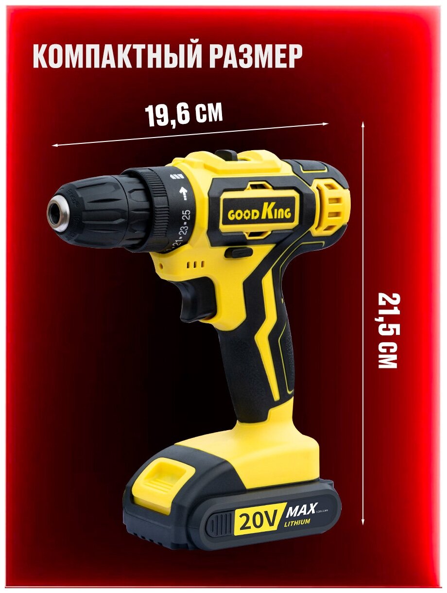 Дрель-шуруповерт, Сменный аккумулятор, 20 В, 30Нм, 1 АКБ, 2000 mAh, GOODKING YL-102001, аккумуляторная дрель-шуруповерт, для дома, для ремонта