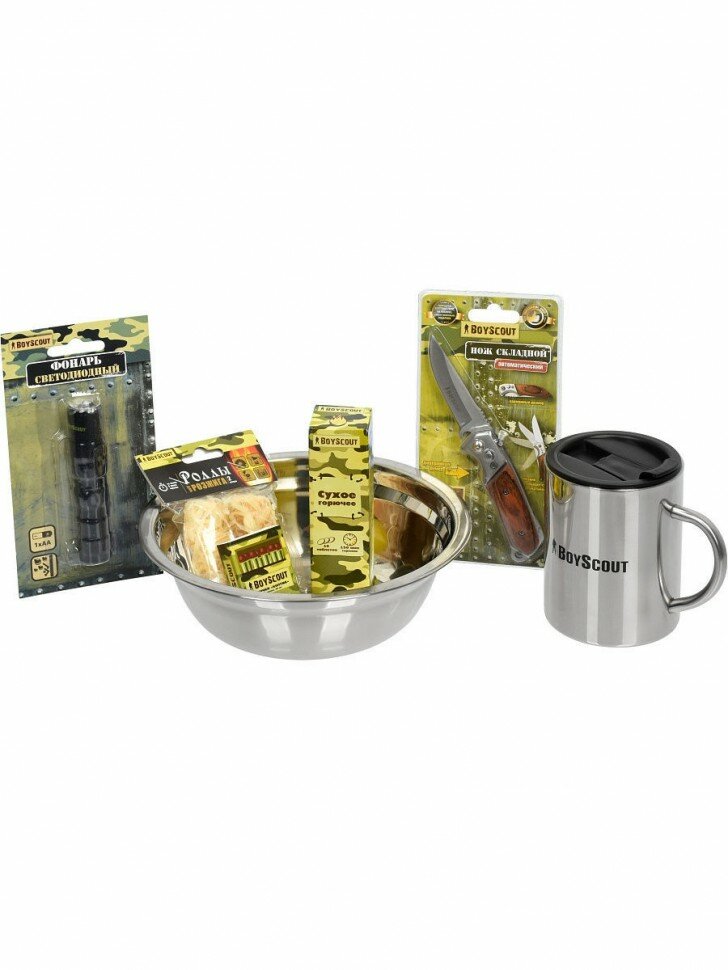 Купить Набор Выжить любой ценой /спички/сухое горючее/роллы для розжига/фонарь/термокружка/нож/миска BOYSCOUT