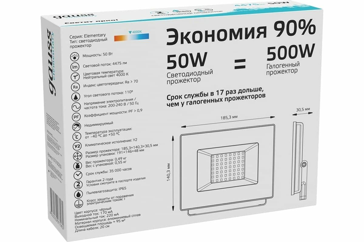 СохранитьПрожектор светодиодный Gauss Elementary 50W 4000К 613100250 интересное: