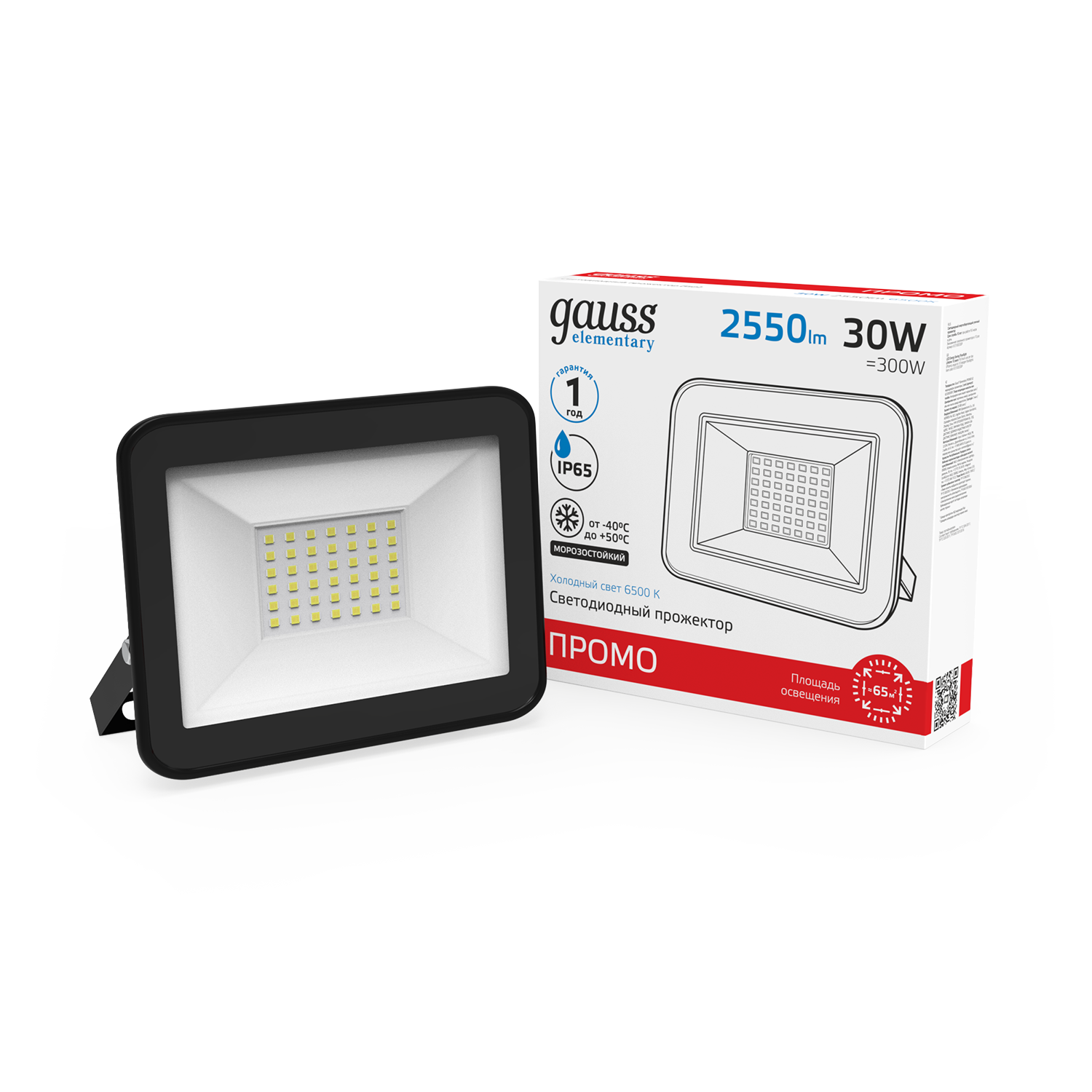 Прожектор светодиодный Elementary 30Вт 2100лм IP65 6500К черн. Промо, GAUSS 613100330P (1 шт.)