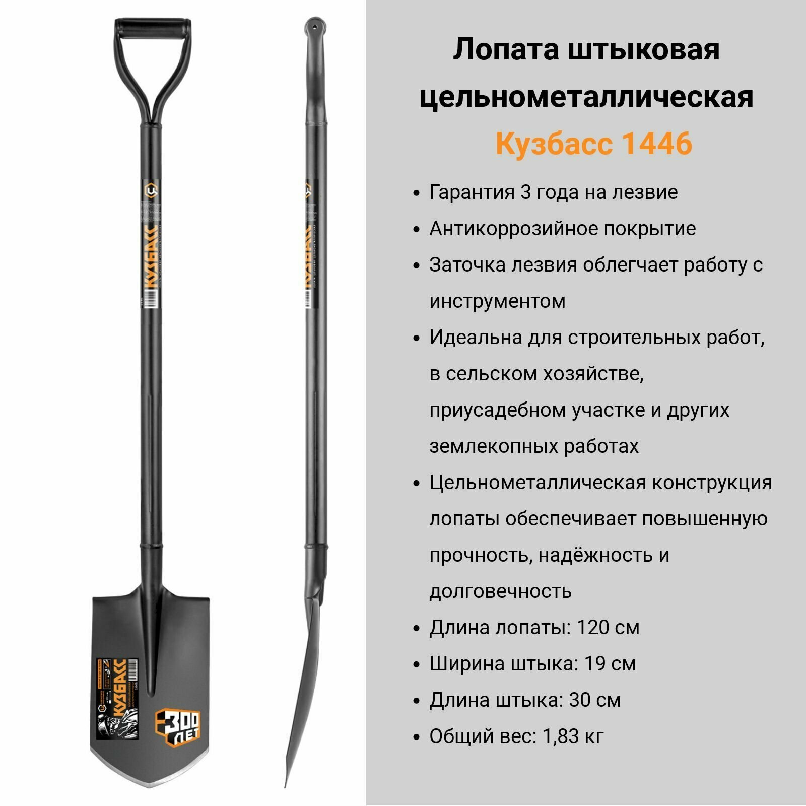 Цельнометаллическая штыковая лопата 120 см Центроинструмент Кузбасс 1446