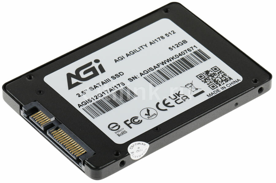 Твердотельный накопитель SSD AGI "2.5" 512GB AI178 Client SATA 6Gb/s, 538/486, IOPS 41/78K, MTBF 1.6M, 3D TLC, 300TBW," 0,54DWPD, RTL{100} (610224)