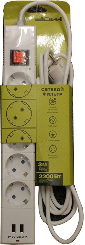 Сетевой фильтр düwi 5 гнезд с-з, 3м, 2USB