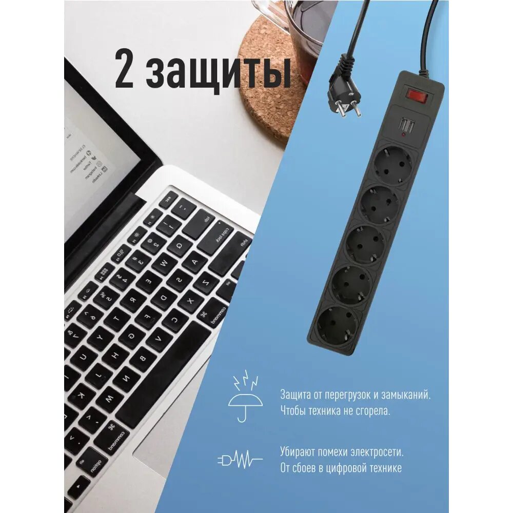 Сетевой фильтр Космос 1 8м 5 гнезд 2 USB разъема черный