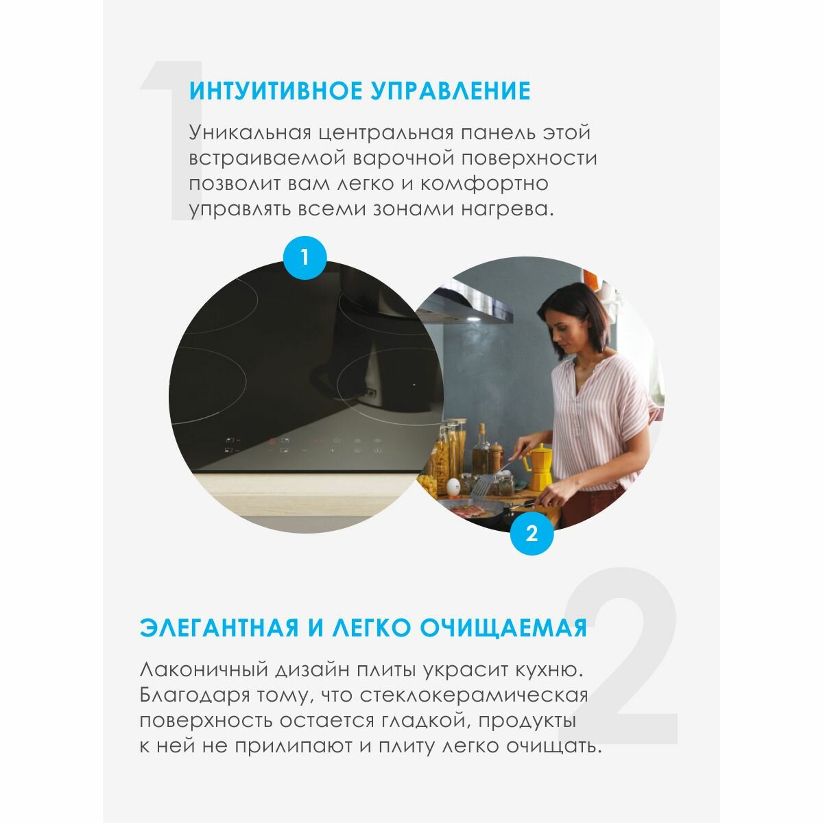 Индукционная варочная панель шириной 60 см. 4 индукционных зоны нагрева. Управление: сенсорное. Booster. Таймер (мульти). Регулировка максимальной мощности подключения 2,5 - 7,4 кВт. Блокировка управления. Индикация остаточного тепла. 9 ступений нагрева.
