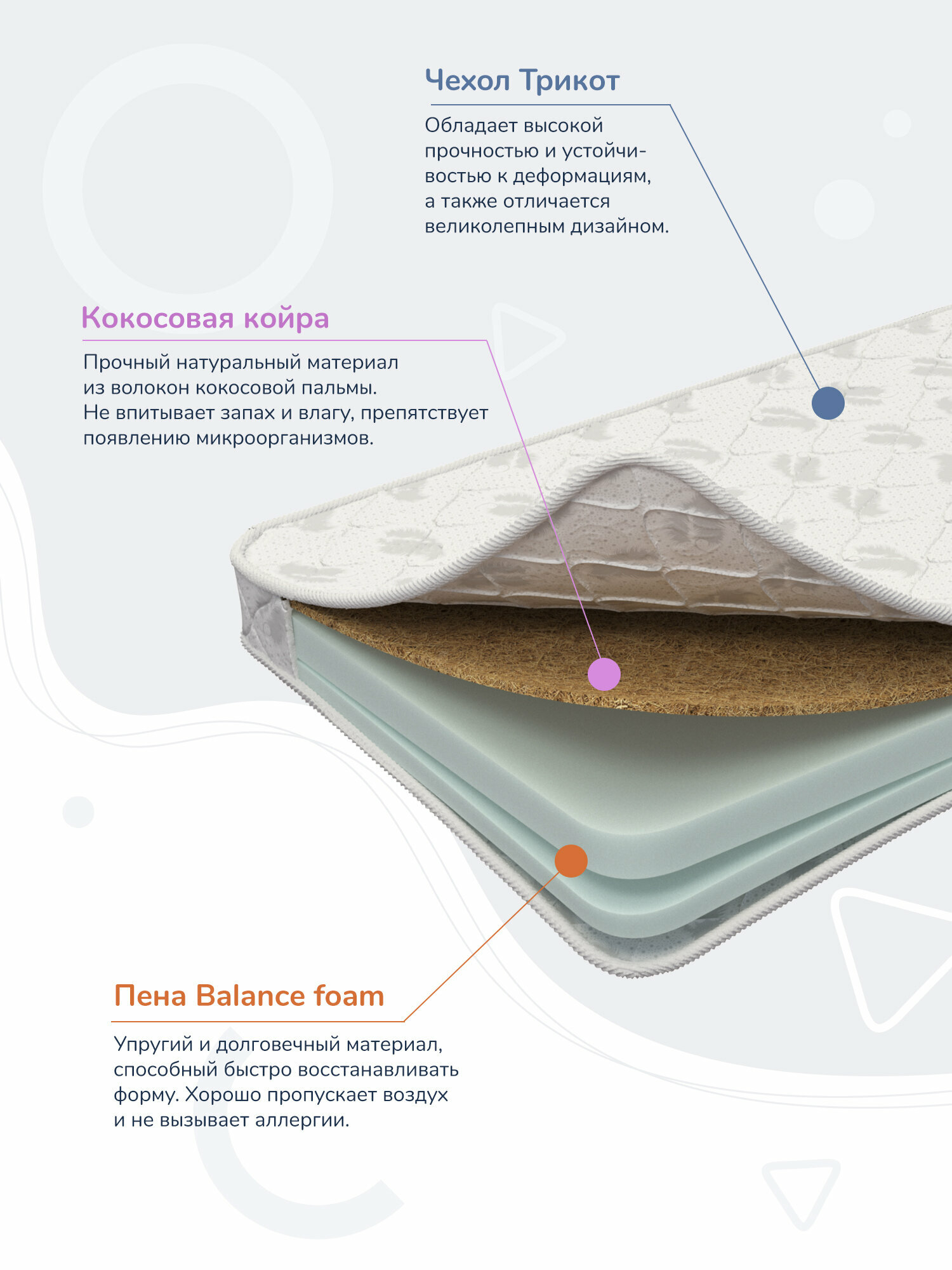 | Дополнительная информация | состав матраса: чехол жаккард, кокосовая койра 1 см, пена Balance foam Certipur 5 см, пена Balance foam Certipur 3 см |