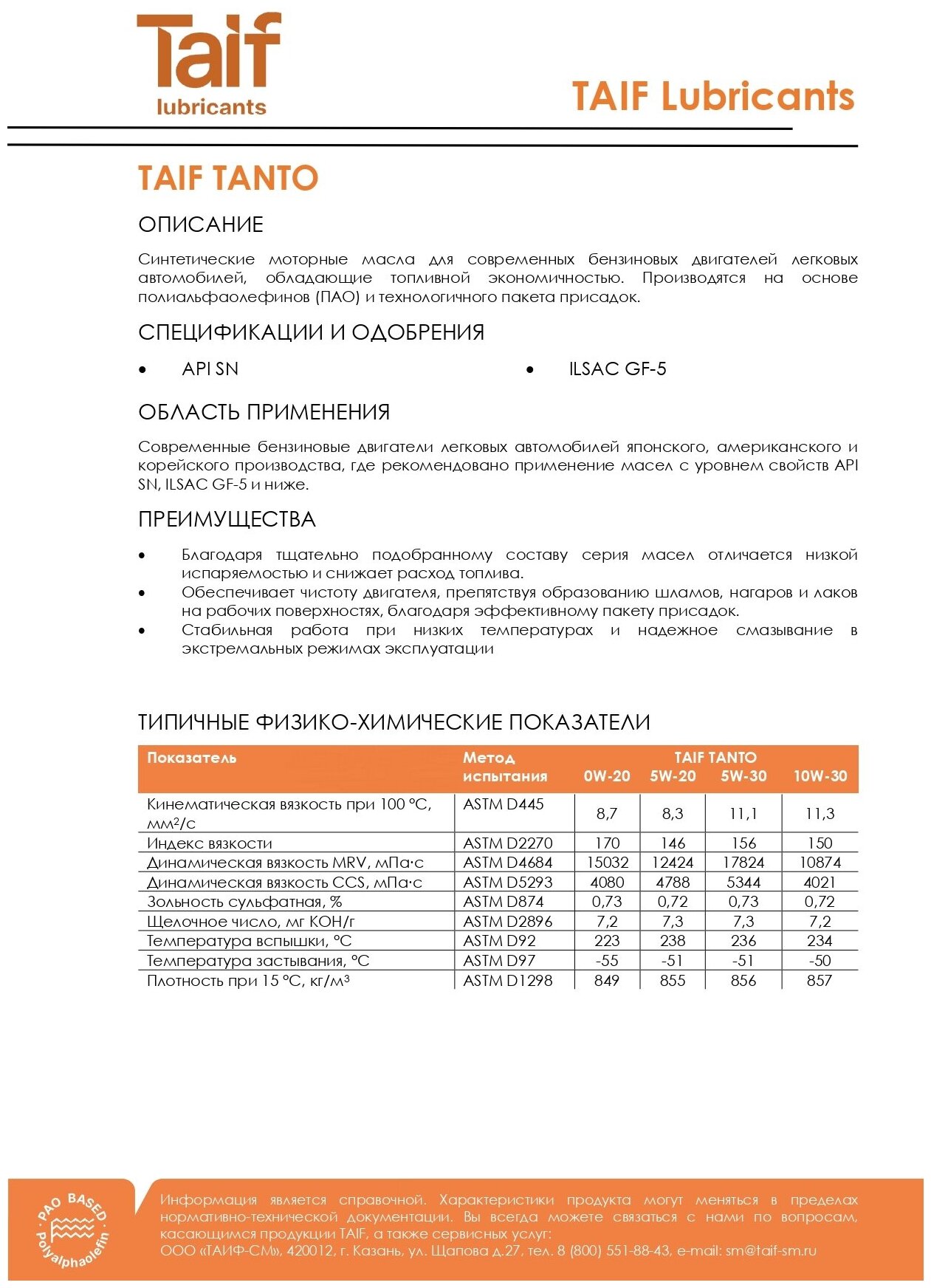 TAIF Масло моторное TANTO 5W-30, 20L API SN, ILSAC GF-5 от официального дистрибьютора, производитель - TAIF, артикул 211043