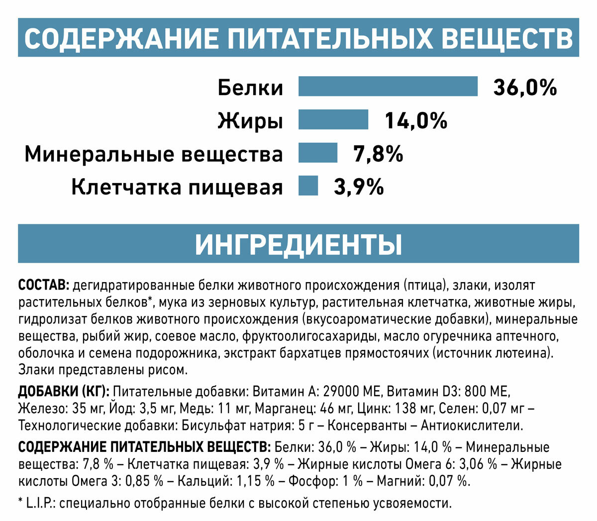 | Состав | дегидратированные белки животного происхождения, животные жиры, рыбий жир, гидролизат белков животного происхождения (вкусоароматические добавки), злаки, изолят растительных белков*, мука из злаков, растительная клетчатка, минеральные вещества, аминокислоты, соевое масло, фруктоолигосахариды, масло огуречника аптечного, оболочка семян подорожника, экстракт бархатцев прямостоячих (источник лютеина) Технологические добавки: Клиноптилолит осадочного происхождения: 5 г - Консерванты - Антиокислители. *L.I.P.: специально отобранные белки с высокой степенью усвояемости. |