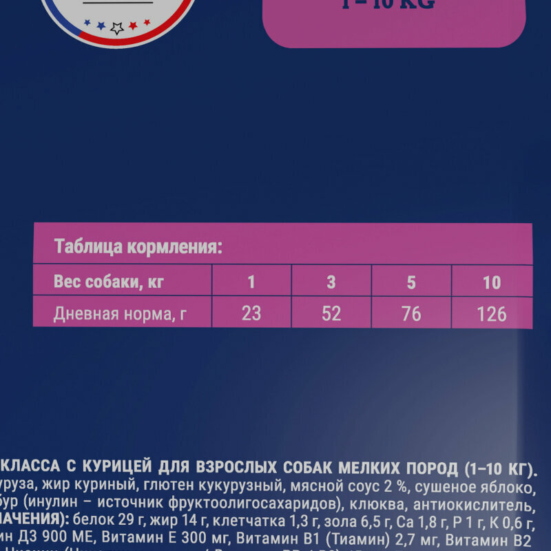 | Состав | дегидрированное мясо 30 %, в том числе мясо курицы 14 %, полба цельнозерновая, маис цельнозерновой, жир куриный (источник омега-6 жирных кислот), маисовый протеин, мясной соус 2 %, яблоко сушеное, дрожжи (источник маннанолигосахаридов), рыбий жир (источник омега-3 жирных кислот), витаминно-минеральный комплекс, топинамбур (содержит инулин - источник фруктоолигосахаридов), клюква, хондропротекторы (глюкозамин и хондроитин), антиокислитель, экстракт розмарина |