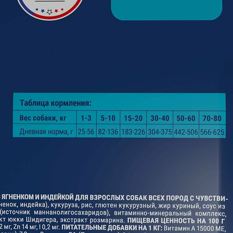 | Состав | дегидрированное мясо 30% (в том числе ягненок, индейка), кукуруза, рис, глютен кукурузный, жир куриный, соус из гидролизованного мяса ягненка 2 %, пульпа свекольная, сушеное яблоко, дрожжи (источник маннанолигосахаридов), витаминно-минеральный комплекс, топинамбур (инулин - источник фруктоолигосахаридов), клюква, антиокслитель, экстракт юкки Шидигера, экстракт розмарина, Омега-3 жирные кислоты, Омега-6 жирные кислоты |