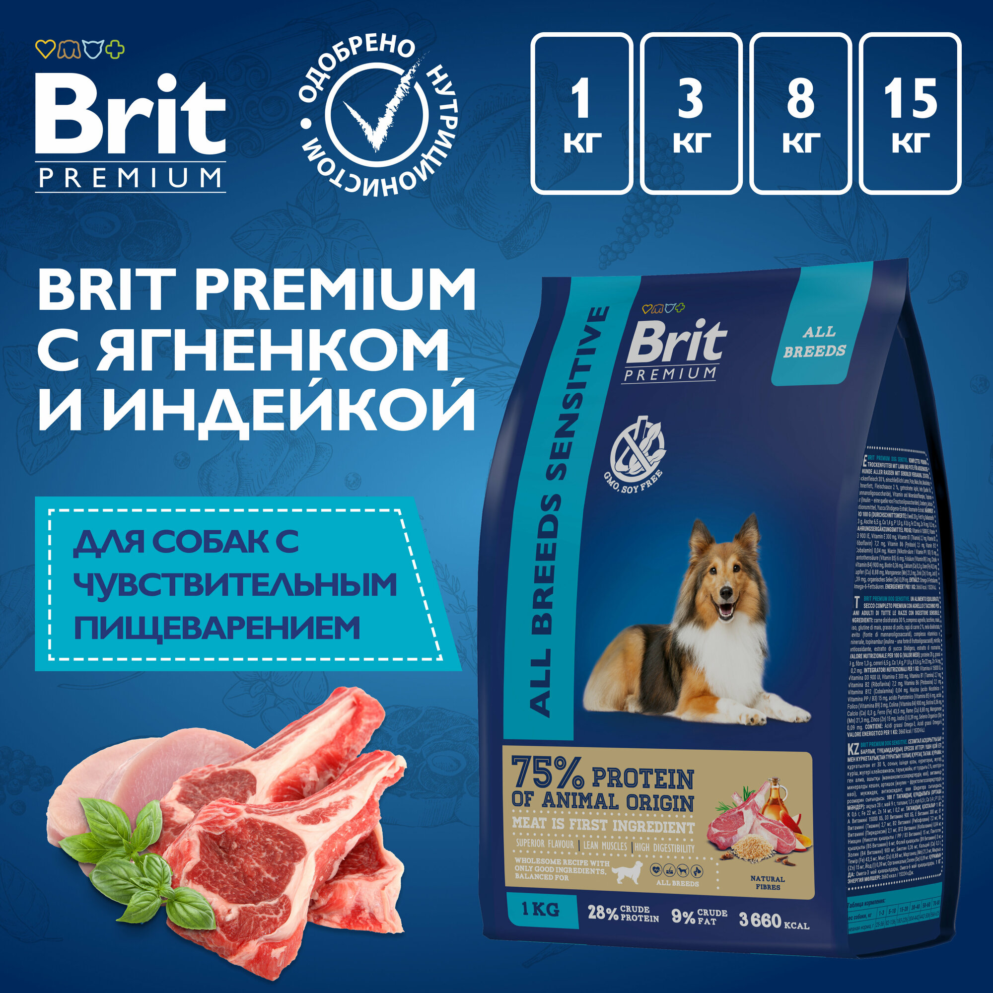 Brit Premium Dog Sensitive 15кг ягненок и индейка (чувствительное пищеварение) сухой корм для собак всех пород