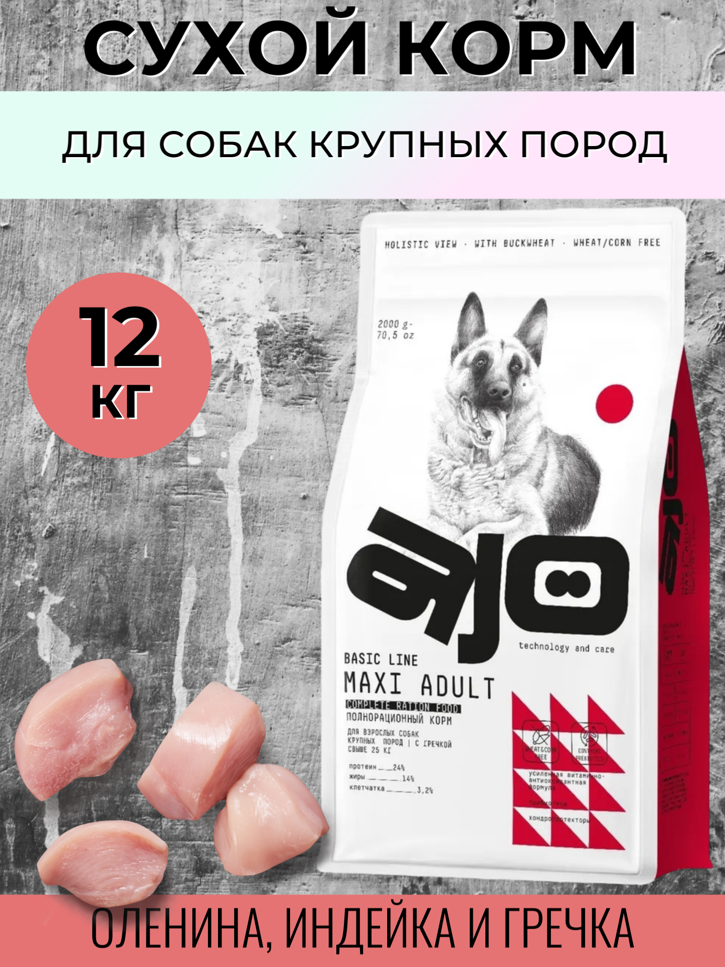 Сухой корм для собак крупных пород Ajo с индейкой, олениной и гречкой 12 кг.