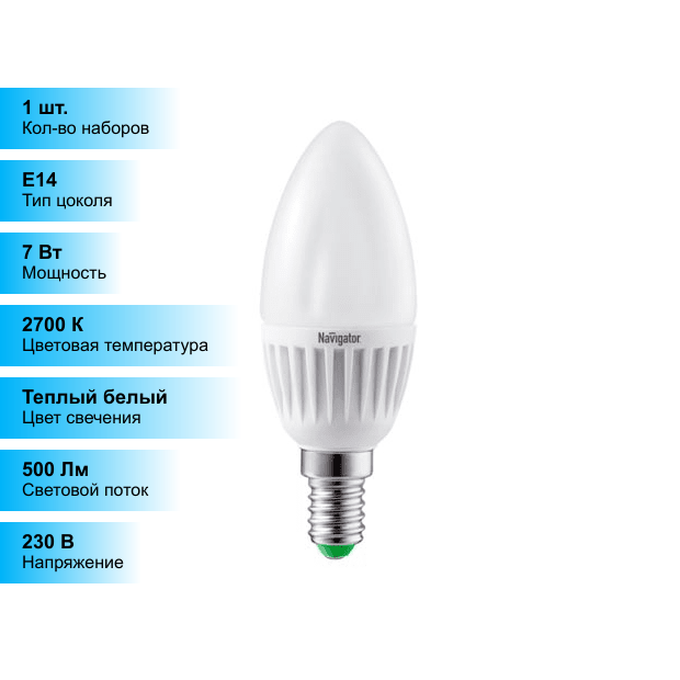 (1 шт.) Светодиодная лампочка Navigator C37 7Вт 230В 2700K E14