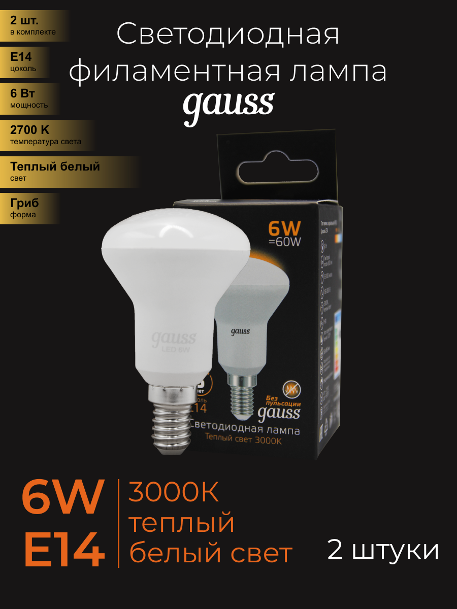 (2 шт) Лампа Gauss R50 6W 500lm 3000K Е14 LED