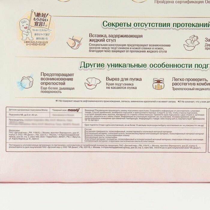 | Комплектация | MOONY Natural подгузники, NB (до 5 кг), 62 шт |