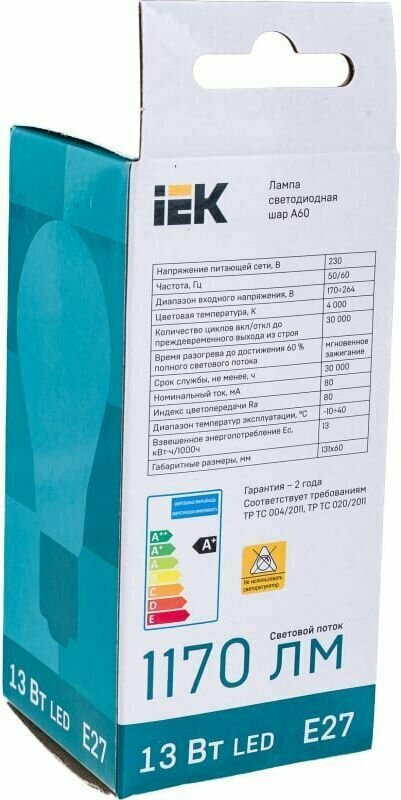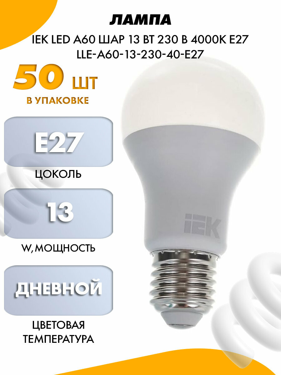 (3 шт.) Светодиодная лампочка IEK ЛОН A60 E27 13W(1170lm) 4000К 4K 110х60 ECO LLE-A60-13-230-40-E27 . Цоколь E27