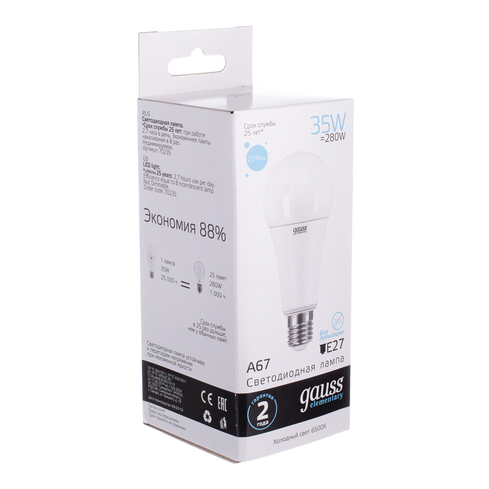 Лампа светодиодная gauss Elementary 70235, E27, A67, 35 Вт, 6500 К