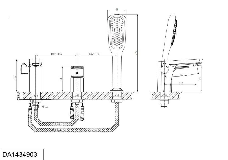 Смеситель D&K Berlin.Touro врезной на борт ванны, 3 отв., золото DA1434903