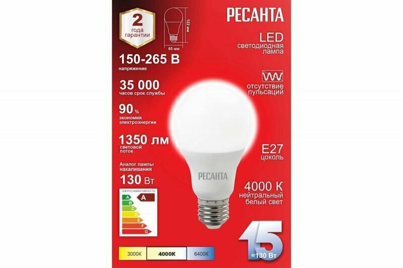 СохранитьСветодиодная лампа РЕСАНТА LL-R-A65-15W-230-4K-E27 (груша, 15Вт, нейтр., Е27) интересное:
