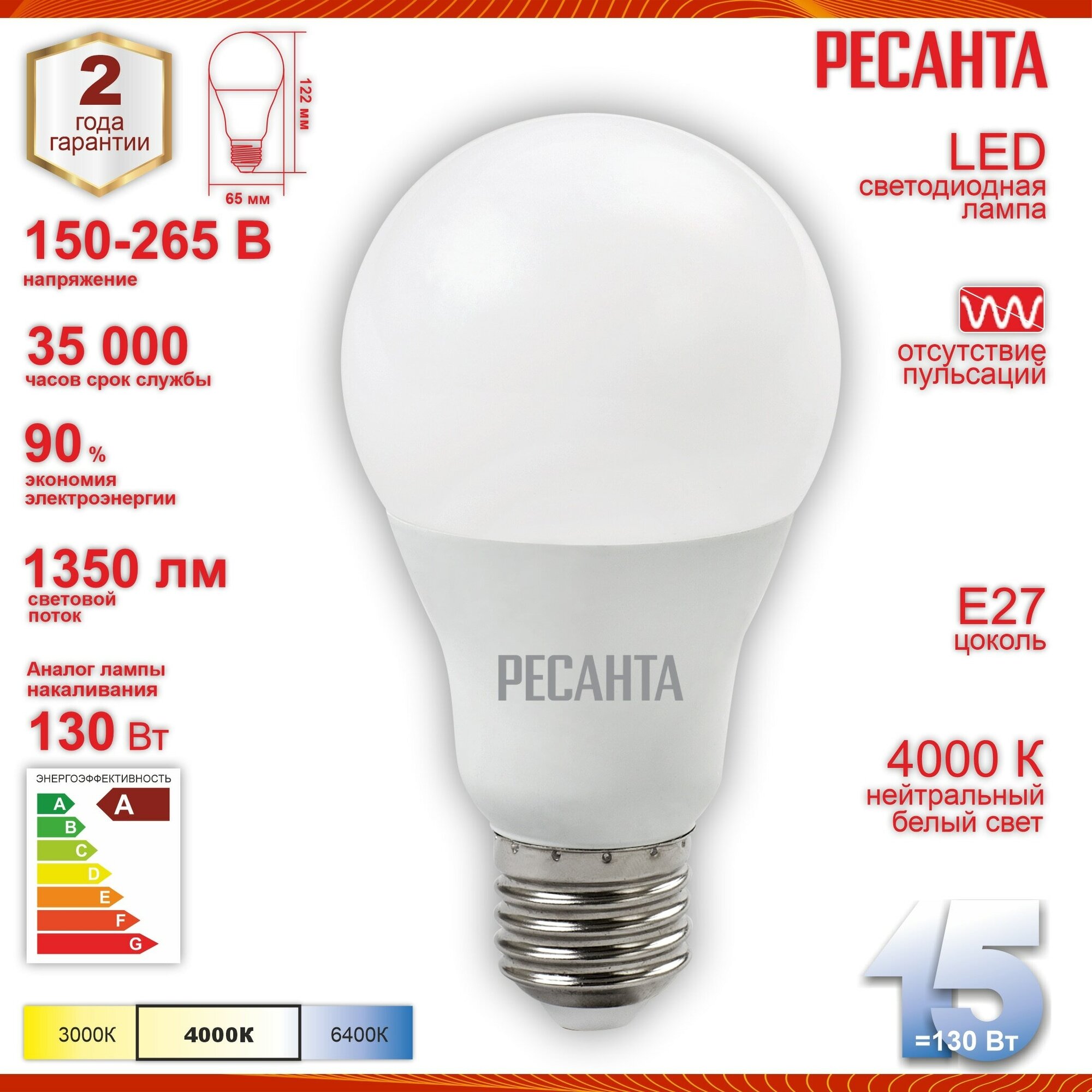 Купить Светодиодная лампа РЕСАНТА LL-R-A65-15W-230-4K-E27 (груша, 15Вт, нейтр., Е27)