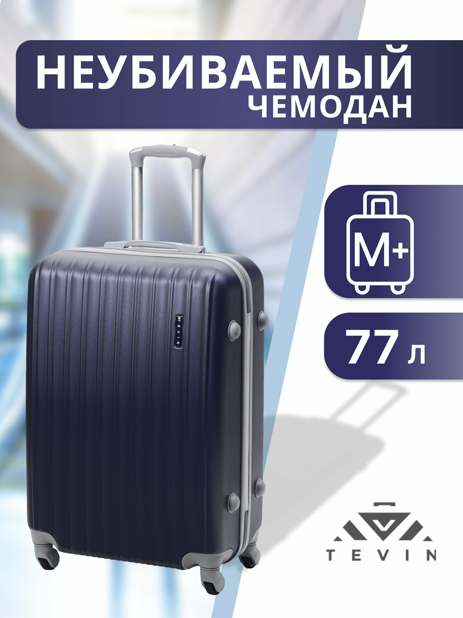 Чемодан TEVIN, 77 л, размер M+, темно-синий