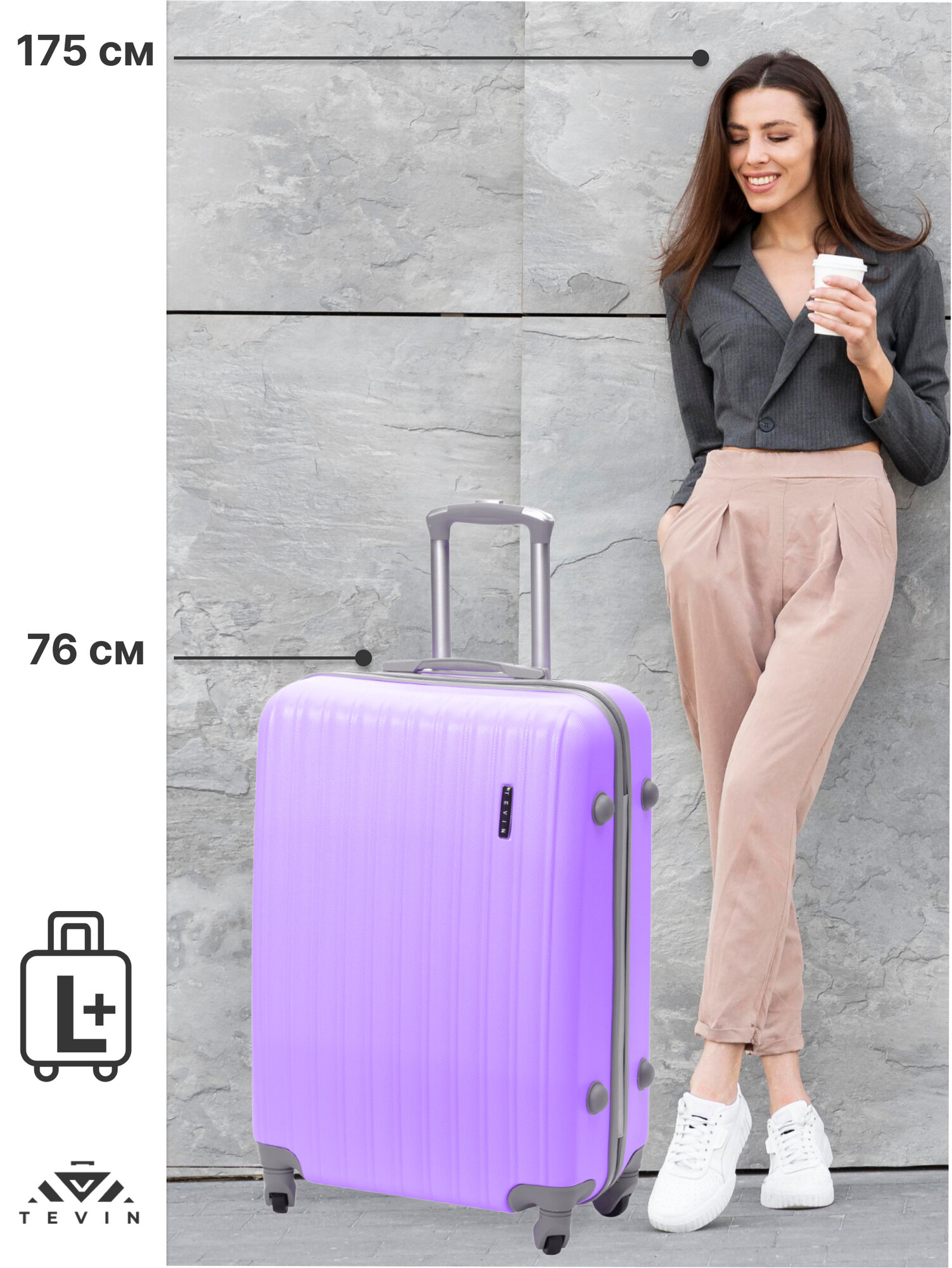 Чемодан на колесах дорожный большой семейный багаж для путешествий l TEVIN размер Л 73 см 105 л легкий 3.8 кг прочный abs пластик Фиолетовый нежный