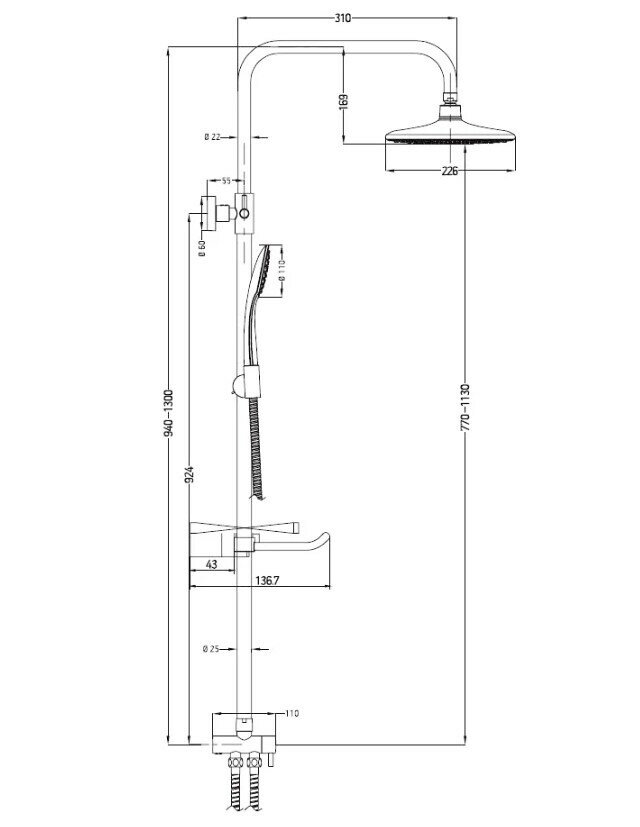 | Дополнительная информация | высота стойки для душа: 1300 мм; диаметр верхнего душа: 226 мм |