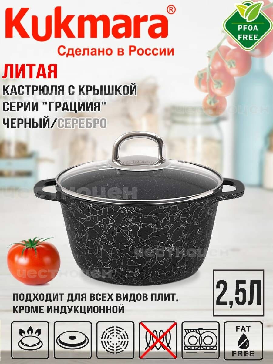 Кастрюля Kukmara Грация антиприграрная литая 2,5л, стеклянная крышка черный/серебро (кчс25а) .