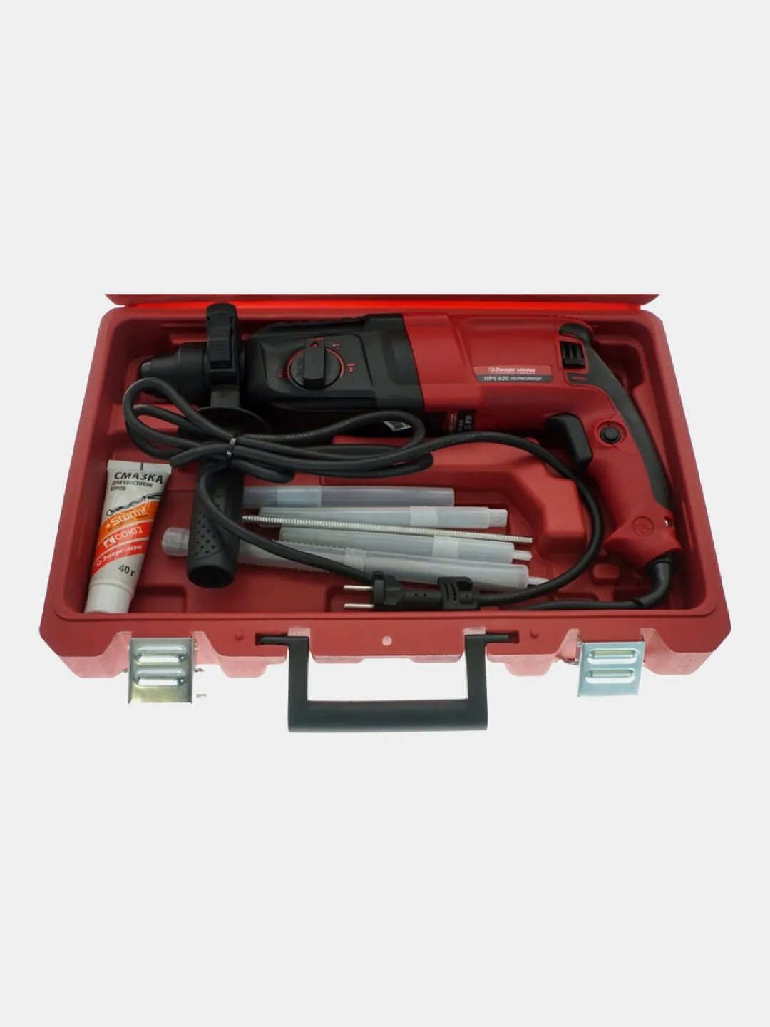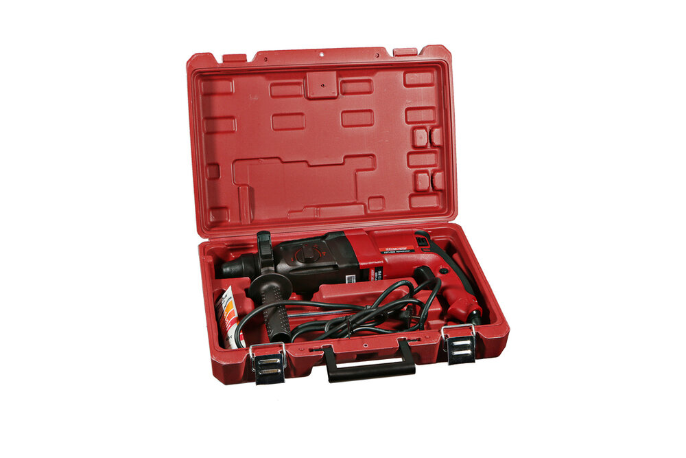 | Комплектация | перфоратор, 3 бура, ограничитель глубины сверления, дополнительная рукоятка, смазка, кейс |
