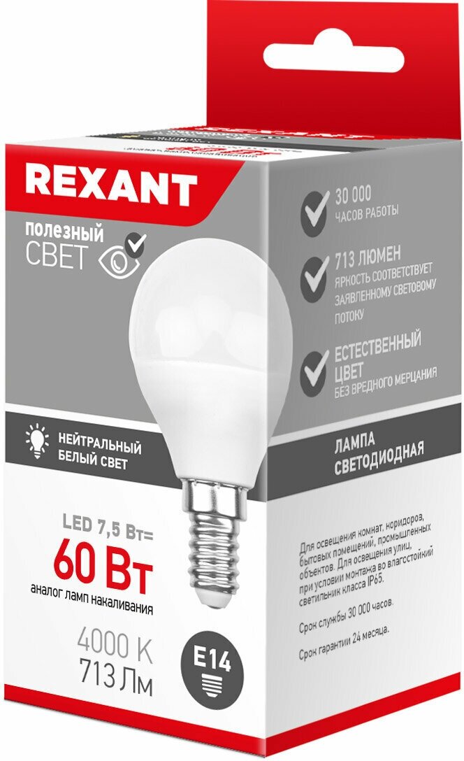 Лампа светодиодная E14, 7.5 Вт, 60 Вт, шар, 4000 К, нейтральный свет, Rexant, GL