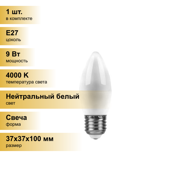 Купить Feron свеча C37 E27 9W(820lm) 4000K 4K матовая 100x37, LB-570 25937 (арт. 694350)