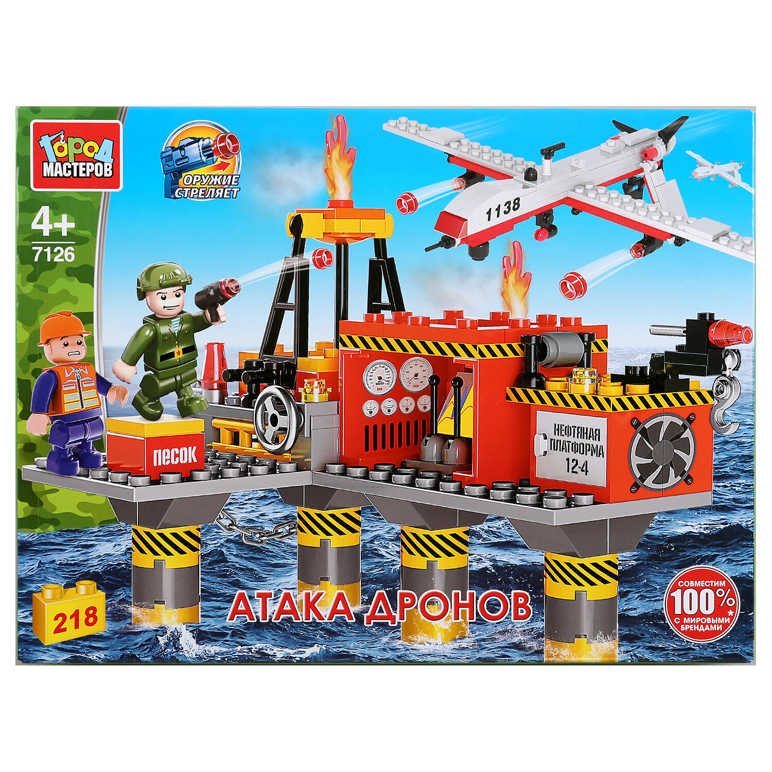 СохранитьКонструктор "Город мастеров" атака дрона на нефтебазу, с фигурками, 218дет. в русс. кор. интересное: