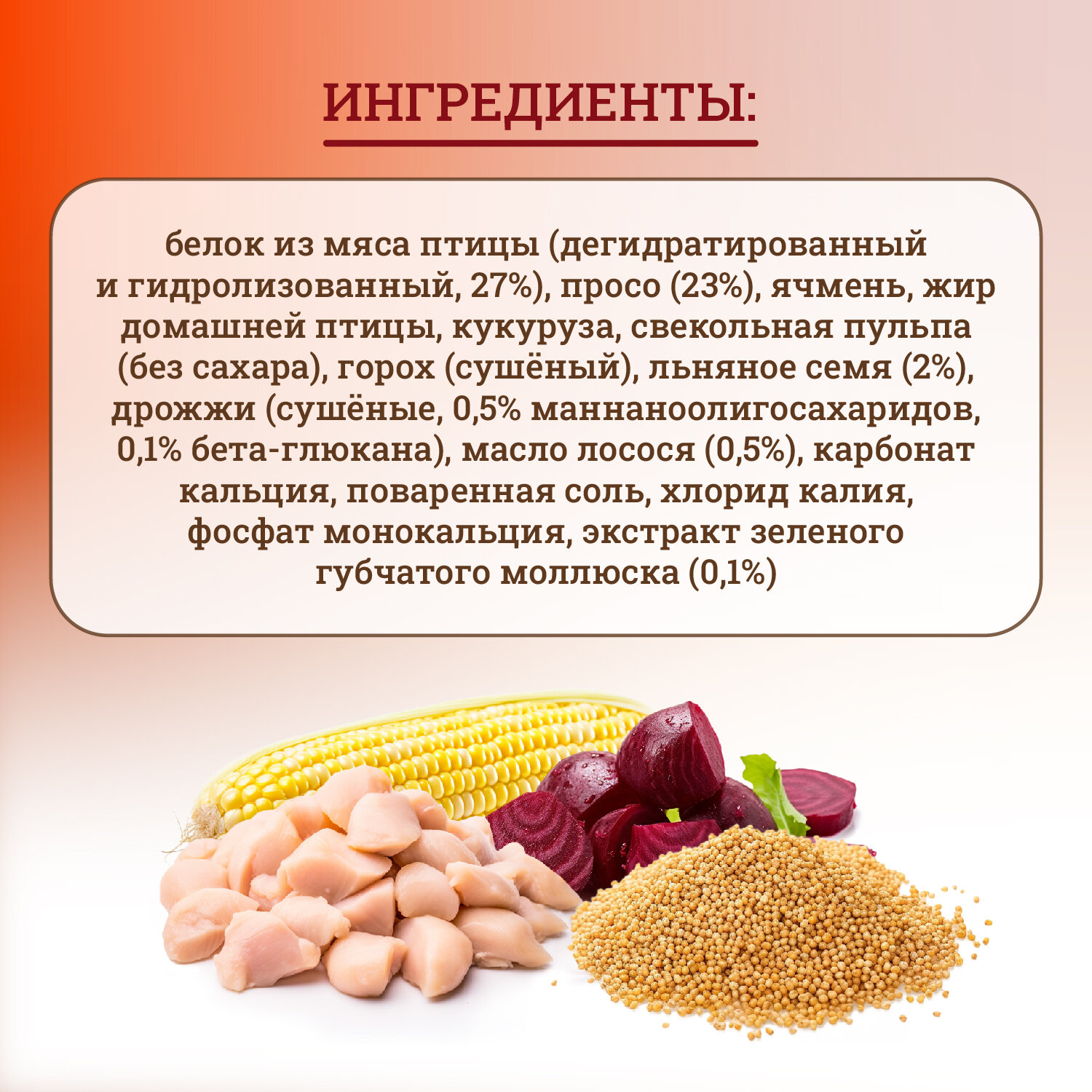| Состав | белок из мяса птицы (дегидратированный и гидролизованный, 27 %), просо (23 %), ячмень, жир домашней птицы, кукуруза, свекольная пульпа (без сахара), горох (сушёный), льняное семя (2 %), дрожжи (сушёные, 0,5 % маннана-олигосахаридов, 0,1 % бета-глюкана), масло лосося (0,5 %), карбонат кальция, поваренная соль, хлорид калия, фосфат монокальция, экстракт зеленого губчатого моллюска (0,1 %) |